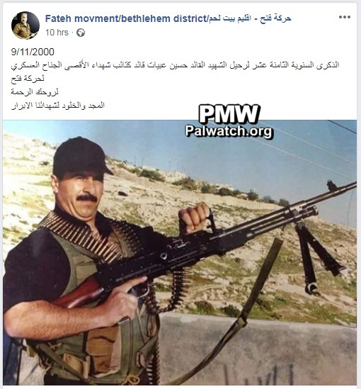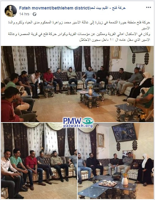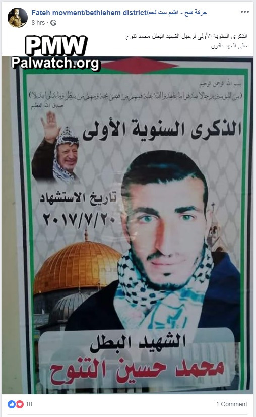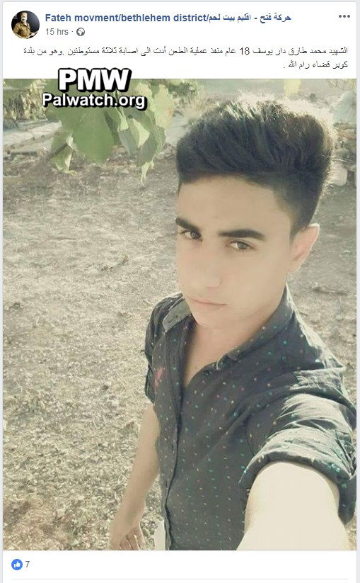 Image on Facebook page of Fatah’s Bethlehem branch shows 17 year old terrorist who stabbed 3 Israeli civilians, killing 1, praising him as a “Martyr”