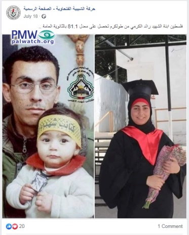Fatah youth movement celebrates graduation of daughter of terrorist who killed 9“Palestine, the daughter of Martyr Raed Al-Karmi (i.e., terrorist, responsible for murder of 9) from Tulkarem, achieved an average of 81.8 in high school”Jul 18, 2019