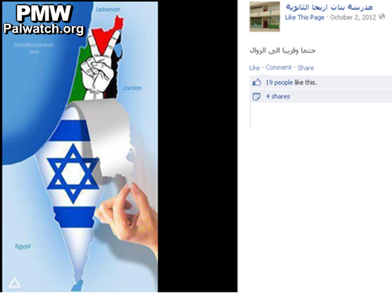The Jericho High School for Girls posted on its Facebook page this image showing Israel being replaced by “Palestine.” The area shown covered by the Palestinian flag is Northern Israel, not parts of the West Bank or the Gaza Strip.