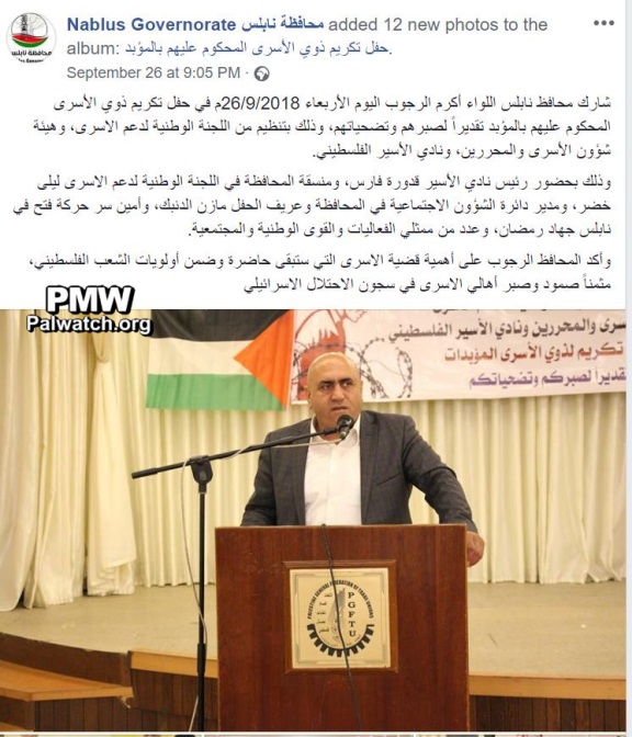 Posted text: “Nablus [District] Governor Maj. Gen. Akram Al-Rajoub participated today (Wednesday, Sept. 26, 2018) in a ceremony honoring the families of the prisoners serving life sentences, in honor of their endurance and their sacrifice. The N ational Committee to Support the Prisoners, the [PLO]...”