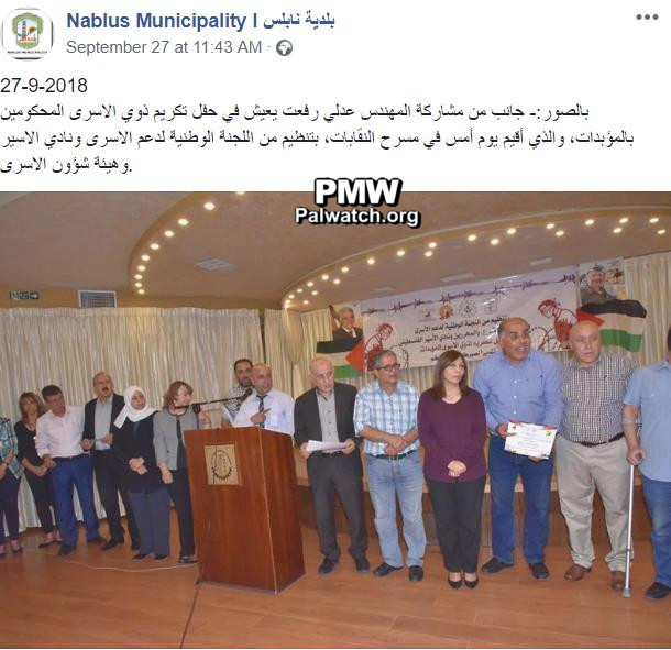 Palestinian Authority District Governor of Nablus participates in ceremony honoring families of Palestinian prisoners serving life sentences, “in honor of their endurance and their sacrifice”