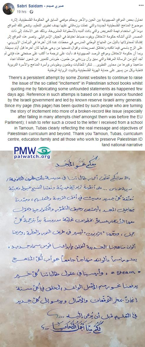 Former Palestinian Authority Education Minister expresses pride in removal of Israel, peace agreements with Israel from PA schoolbooksText and image posted on the Facebook page of Fatah Central Committee member and former PA Minister of Education Sabri Saidam Posted text: "[Israeli newspaper] Yediot Aharonot published an article today [Oct. 7, 2019] related to the Palestinian [PA] schoolbooks, which says: 'In the last three..."Oct 7, 2019