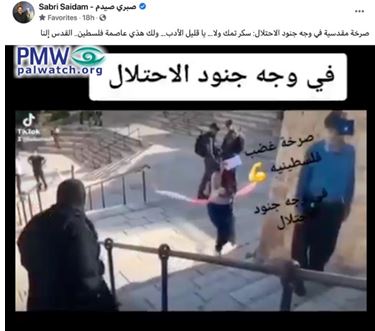 "Shut your mouth, you insolent one! This is the capital of Palestine! Jerusalem is ours!” – yells old Palestinian woman at Jerusalem IDF soldierTop Fatah official Sabri Saidam posts video of old woman verbally assaulting Jerusalem soldierApr 24, 2021