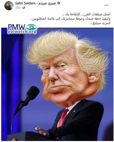Fatah official Sabri Saidam wants to put Trump “on the wanted list” for "you and your gang of merchants’ annexation plan"Along with a grotesque caricature cartoon of Trump, Saidam calls for Trump's "removal"Nov 7, 2020