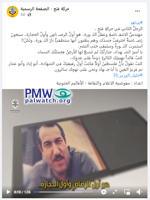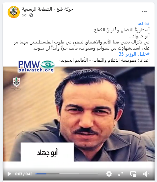 On the 35th anniversary to his death, Fatah glorifies Abu JihadThe Gaza strip branch of Fatah praises terrorist murderer of 125 Abu Jihad on its Facebook pageApr 12, 2023