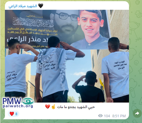 Children salute picture of teen PIJ member, wearing shirts in his honorTeen’s shirt quotes dead teen terrorists: “Martyr after Martyr, and may we be next”Sep 15, 2023
