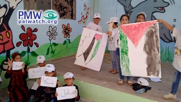 PA inaugurates 'prisoners' garden' in Al-Adawiya Girls High school, complete with displays that erase Israel, posters held by school girls which feature mass-murderers, and kids putting on a play about an Israeli soldier harming a Palestinian prisoner