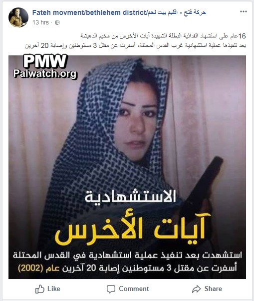“Today is the anniversary of the death of heroic Martyr (Shahid) Ali Munir Yusuf Ja’ara (i.e., suicide bomber, murdered 11)
