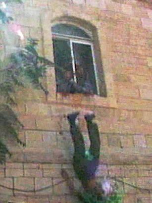 On Oct. 12, 2000, a Palestinian mob brutally murdered and mutilated the bodies of two Israeli reservists who had accidentally entered Ramallah. A well-known picture from the gruesome murder showed a Palestinian raising his bloodied hands heroically, showing the crowd his hands covered in the blood of his victims. The bodies of the two Israelis were thrown out of the window, and the mob dragged them through the streets of Ramallah. (Photo credit: Agence France Presse)
