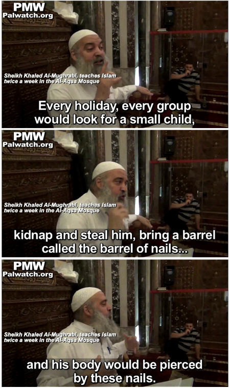 A Palestinian teacher from the Al-Aqsa Mosque, which is situated on the Temple Mount in Jerusalem, taught in his lesson on May 29, 2015, that the reason Europeans expelled Jews and the reason the Nazis burnt Jews in the Holocaust, was because Jews use the blood of non-Jewish children to make matzah bread for Passover. According to Sheikh Khaled Al-Mughrabi, “they were burned in Germany because of these things.”