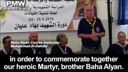 As Palestinian Media Watch has documented, the Jerusalem Scout Commission of the Palestinian Scouts and Guides Association (English - Palestinian Scout Association - PSA), which is a member of the World Organization of the Scout Movement (WOSM), recently held a course named after terrorist Baha Alyan who murdered 3 Israelis on a bus in Jerusalem in October last year.