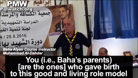 A 30-minute long video from the closing ceremony of the “Martyr Baha Alyan Course” posted on the Jerusalem District Scout Commission’s Facebook page shows course instructor Muhammad Al-Dahdar glorifying murderer Baha Alyan, and expressing the hope that all the 250,000 scouts in the Palestinian Scout Association “are following Baha’s path.” After this statement, Al-Dahdar explicitly says he is speaking “in the name of the Palestinian Scouts and Guides Association”: