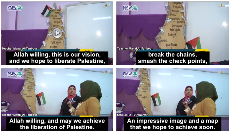 A Palestinian teacher and her school's principal appeared on official PA TV, and the teacher openly expressed the school's educational methodology, teaching students about the anticipated end of Israel. An exhibition at the school featured a map of "Palestine," which included all of Israel and the PA areas, and displayed numerous small ripped Israeli flags and large whole Palestinian flags. The flags represent Israeli sovereignty being replaced by Palestinian sovereignty over all of Israel. To make sure there is no doubt about the meaning, the teacher stressed: "We hope to liberate Palestine." The PA TV host thanked the principal for this quality education of Palestinian children: