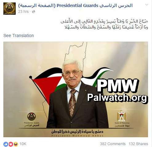 Palestinian Authority Presidential Guards Facebook posts image of Abbas with map of “Palestine” erasing Israel