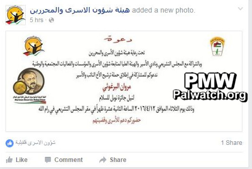 PLO Commission of Prisoners’ Affairs invites Palestinians to event launching campaign to give a convicted terrorist the Nobel Peace Prize