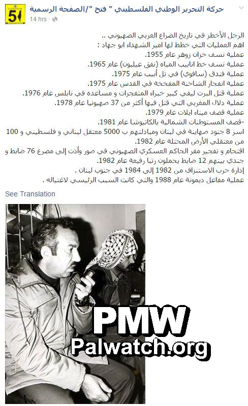 Fatah glorifies terrorist Abu Jihad and lists his biggest attacks, which killed over 125