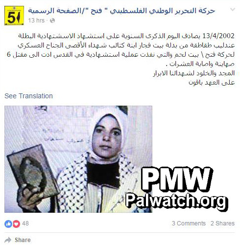 Text in post: “April 13, 2002 – today is the anniversary of the death as a Martyr (Shahida) of the Martyrdom-seeker (Istish'hadiya), the hero Andalib Takatka from the town of Beit Fajjar, daughter of the Al-Aqsa Martyrs’ Brigades - Fatah’s military wing - in Bethlehem, who carried out a Martyrdom-seeking operation in Jerusalem in which 6 Zionists were killed, and dozens injured.
