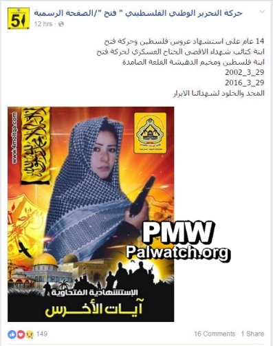Posted text: "14 years since the death as a Martyr (Shahida) of the bride of Palestine and the Fatah Movement