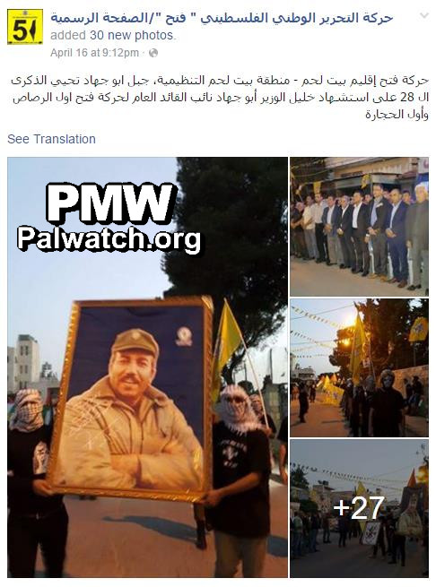 Text and photos posted on the official Fatah Facebook page. The photo on the left in the collage is a picture of terrorist Khalil Al-Wazir ‘Abu Jihad,’ responsible for the deaths of 125 Israelis. The photo shows a large sign in honor of the event featuring the pictures of terrorists Dalal Mughrabi and Marwan Barghouti.