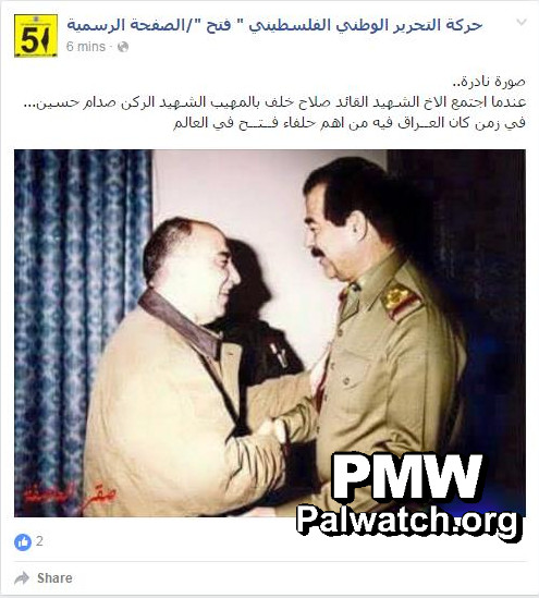 Posted text: “A rare picture. When Martyr (Shahid) Commander Salah Khalaf met with the awe-inspiring Martyr [former Iraqi President] Saddam Hussein, during a period in which Iraq was among Fatah’s most important allies in the world.”