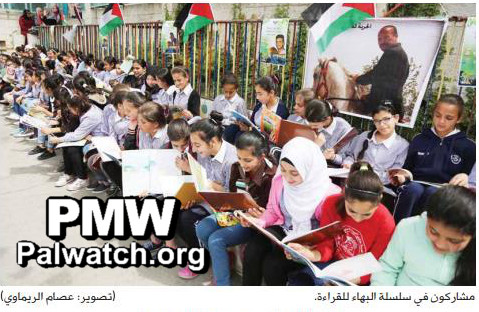 “Hundreds of students of the El-Bireh schools and institutions participated in the Baha [Alyan] (i.e., terrorist who murdered 3) chain of readers yesterday [April 24, 2016] to mark [Palestinian] Prisoner’s Day, which was organized by the El-Bireh municipal library in cooperation with the [PA Ministry of Education’s] Education Directorate, the Family Revival Society, and a number of the city’s institutions in the Al-Mughtaribin School courtyard. In his speech, attorney Muhammad Alyan, father of Martyr (Shahid) Baha Alyan, noted that his Martyr son loved to read and participated in the chain of readers that was held surrounding the walls of Jerusalem… The school’s director, Aziza Zalum, gave a speech in which she emphasized the importance of organizing such activities, which convey two principle messages - that the struggle is not in conflict with the love for seeking knowledge or with the love of life. In a speech he gave in the name of the municipality, El-Bireh municipality council member Hussein Al-Tawil praised the struggles and sacrifices of the prisoners, saluted the prisoners’ families, and noted that our people is renewing its vow to the prisoners.”