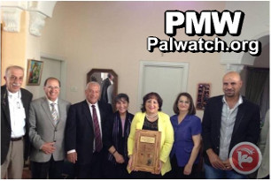 On the plaque of honor appears the PA map of “Palestine” that presents all of Israel as “Palestine” together with the PA areas.