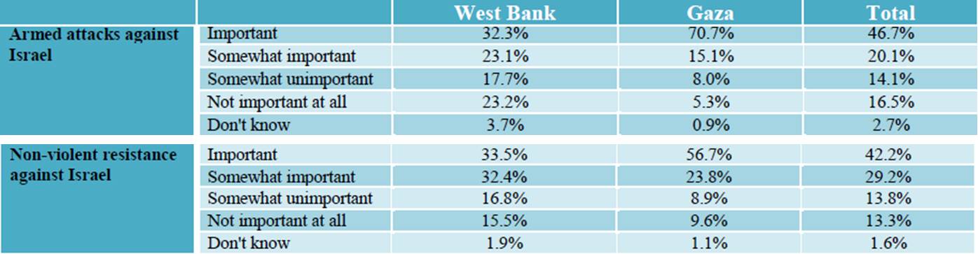 April 2016 poll: Majority of Palestinians consider “armed attacks against Israel” and “non-violent resistance” to be important