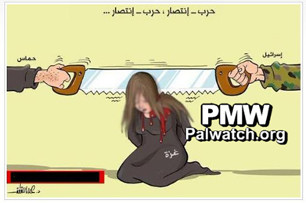 Fatah cartoon criticizes Hamas and Israel, depicts Gaza as a woman being decapitated by Israel and Hamas