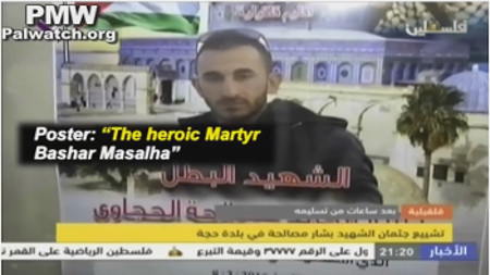 - Official PA TV reporter: “Martyr Bashar Masalha, 22, ascended to Heaven in Jaffa on March 8 [2016]... He returned and was embraced by his homeland as a Martyr within it.”