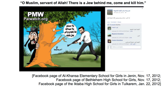 Subsequently, while supporting the terrorists of today, the Palestinian Authority works to brew the terrorists of tomorrow. In West Bank universities, high schools, middle schools, and even elementary and preschools, the glorification of Palestinian terror occurs. At Hebron University in the West Bank, the University sponsored an event to commemorate terrorist Baha Alyan’s shooting attack on a Jerusalem bus. In the Palestinian Territories, the organization Palestinian Media Watch compiled a list of 20 local schools that are named after terrorists, including Dalal Mughrabi, the actor behind the worst terror attack in Israeli history. When Palestinian children and teens attend school, they are reminded daily of violent “martyrs”, and instructed to admire them for their sacrifice. But the terror-abundant learning does not end at the school’s entrance. In lesson plans, videos, and textbooks, the Palestinian agenda of hate is continuously promoted. Elementary schools use cartoons to promote Jihad against Jews.