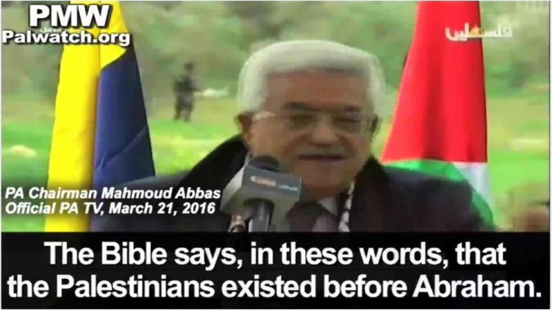 Abbas' statement about the Bible is false. The only Biblical reference Abbas could be talking about is the text that Abraham dwelt "many days in the land of the Philistines." (Genesis 21: 34). However, the Philistines have no connection to today's Palestinian Arabs. The Philistines were a people of Greek origin who settled in the land of Canaan and lived beside the Israelite tribes. The Palestinians who are Arabs could not have had ancestors in the land from biblical times predating Israelite and Judean statehood because Arabs only arrived in the land in 637 CE with the Muslim invasion. Needless to say, the "Palestinians" are not mentioned in the Bible. Significantly, Abbas says that this "fact" - which is a fabrication - is what gives Palestinians a "right" to the land.