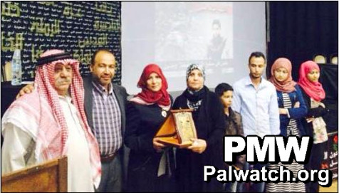 The photo shows Palestinian murderer Muhannad Halabi’s family receiving a plaque of honor during the ceremony.