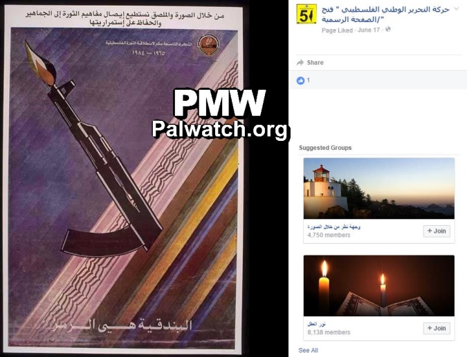 Poster posted on the official Fatah Facebook page. The poster, from 1984, shows an assault rifle with a flame coming out of its barrel.