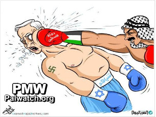 Cartoon titled "Knockout" shows a boxer representing "Palestine" - his glove is in the colors of the Palestinian flag and labelled: "The State of Palestine" - delivering the knockout blow to Israeli Prime Minister Benjamin Netanyahu, who has a swastika tattooed on his arm, Stars of David on his gloves, and the name "Netanyahu" on his belt.