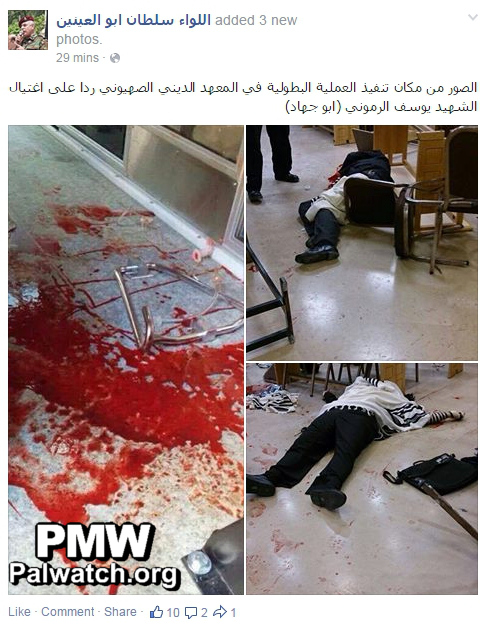 Based on his previous statements and Facebook posts it is clear that his statement promoting murder should be taken literally. Abu Al-Einein has stated in the past that killing Jews/Israelis is not merely a Palestinian national goal but is what Allah demands of Palestinians as an Islamic necessity. After a bloody terror attack in November 2014 in which 4 rabbis were murdered during prayer in a synagogue in Jerusalem, Abbas’ advisor posted pictures of the dead rabbis and a picture of their blood on his Facebook page to celebrate the murder. He wrote that the butchering of the rabbis with axes and kitchen knives was "the heroic operation at the religious Zionist institute.”