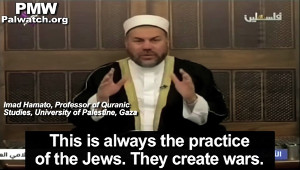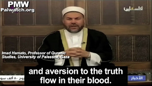 This denial of Palestinian Authority Antisemitism, which Palestinian Media Watch has documented repeatedly, is another example of PA doublespeak. Just a week before, official PA TV teacher of Islam, Imad Hamato, was instilling hatred of Jews in Palestinian viewers, explaining that from early Islamic stories we learn that "Jews are a people of lies."Hamato, who hosts a weekly TV program and is also Professor of Quranic Studies at the University of Palestine in Gaza, told a story about Jews from the time of Muhammad who admired and praised a fellow Jew as their leader, until they heard he converted to Islam, then they denied him. Hamato presented the Jews' change of opinion as proof that Jews are liars, and that "lies, distortion of the truth, and aversion to the truth flow in their blood."