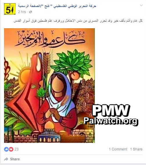 Fatah Facebook: “A [new] year and its blessings will come” when the Al-Aqsa Mosque “is liberated from the impurity of the occupation (i.e., Israel)” with image of map of “Palestine” with woman holding rifle