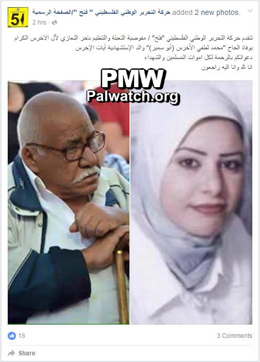 In a similar show of support for terrorism and murder, Abbas’ Fatah Movement posted condolences on the occasion of the death of the father of 17-year-old suicide bomber Ayyat Al-Akhras who murdered 2 when she blew herself up in Jerusalem in 2002. The condolences were posted together with a photo of the deceased father as well as a photo of murderer Ayyat Al-Akhras.