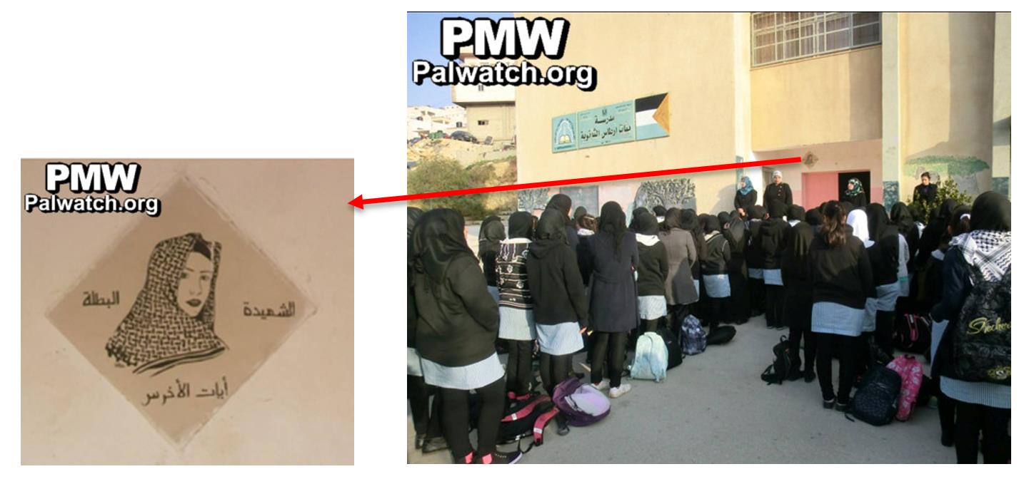 The PA and Fatah honor Ayyat Al-Akhras regularly and present the 17-year-old female suicide bomber as a role model for other young girls. For example, the Artas High School for Girls near Bethlehem chose to put the terrorist’s picture right over the entrance to the school with the caption: