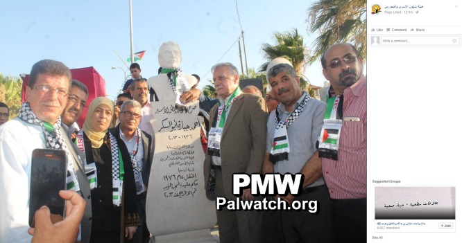 The photo shows the monument erected to Palestinian terrorist Ahmad Jabarah Abu Sukkar in the town of Turmus Ayya on July 17, 2016. In the picture Governor of Ramallah and El-Bireh District Laila Ghannam is to the left of the monument, wearing a yellow head covering, Director of PLO Commission of Prisoners’ Affairs Issa Karake is between Ghannam and the monument, Chairman of the Palestinian Prisoners’ Club Qadura Fares is furthest to the left, Chairman of the PA Committee Against the Wall and Settlements Walid Assaf is second from the right, and Deputy Secretary-General of the Democratic Front for the Liberation of Palestine (DFLP) and PA Parliament Member Qais Abd Al-Karim is directly to the right of the monument.