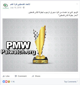 The image shows the logo, featuring a trophy in the shape of the PA map of “Palestine” that presents all of Israel as “Palestine” together with the PA areas colored in gold, and a keffiyeh (Arab headdress) pattern behind the map.