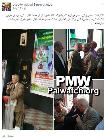 Posted text: “Brother leader Fatah Central Committee member Abbas Zaki participates in the Martyrdom (Shahada) celebration in Dura together with the family of heroic Martyr (Shahid) Muhammad Al-Faqiat (sic., Al-Faqih), who ascended to Heaven during an armed conflict with the occupation that lasted for seven full hours.”