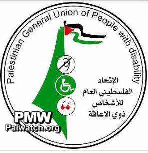 The logo of the Palestinian General Union of People with Disability appears in the article. The logo shows the PA map of “Palestine" that presents all of Israel as "Palestine" together with the PA areas, with a Palestinian flag flying from the top of the map. Over the map are symbols for people with hearing and vision disabilities, and people who are wheelchair bound.