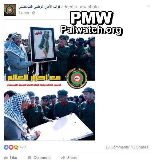 Palestinian Authority National Security Forces Facebook posts image of Arafat holding map of “Palestine” that erases Israel