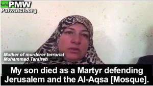 Mother of terrorist murderer Muhammad Taraireh: "My son is a hero. He made me proud. My son died as a Martyr defending Jerusalem and the Al-Aqsa Mosque. Praise be to Allah, Lord of the Worlds, he [my son] has joined the Martyrs before him, and he is not better than them. Allah willing, all of them will follow this path, all the youth of Palestine. Allah be praised."