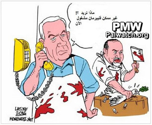 The cartoon shows Israeli Prime Minister Benjamin Netanyahu wearing a blood stained apron answering a telephone and saying: “What do you want?! It is not possible, [Israeli Minister of Defense Avigdor] Liberman is busy now.” Liberman, who is also wearing a blood stained apron, is poised to slaughter a dove with an olive branch in its beak representing peace. Blood is splattered on Liberman’s cleaver, indicating he has already killed with it.