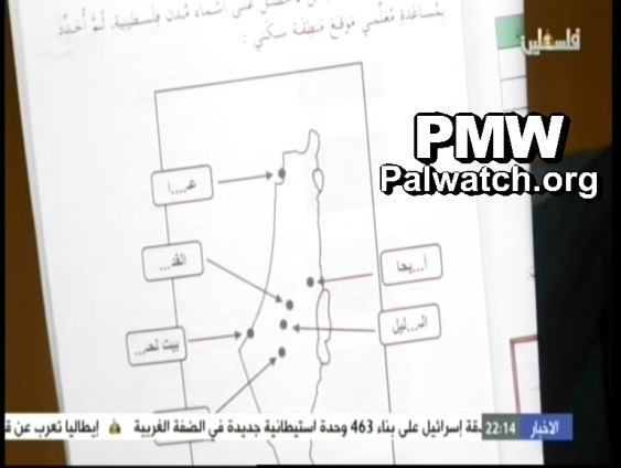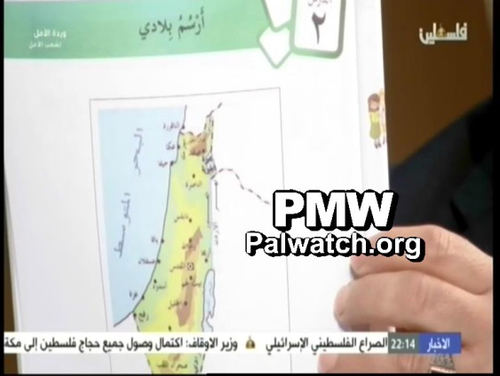 An outline of the PA map of “Palestine" that presents all of Israel as "Palestine" together with the PA areas from a Palestinian schoolbook is shown.