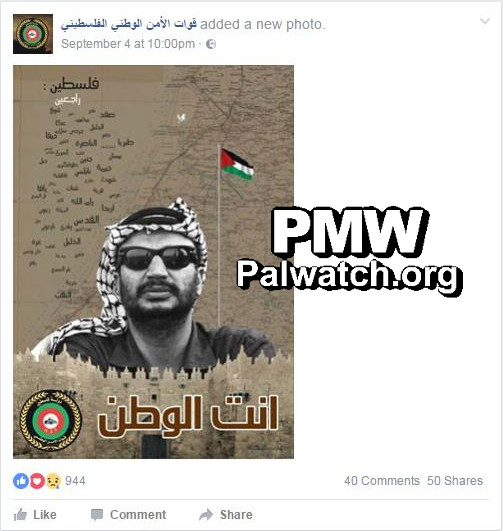 Image posted on the Facebook page of the PA National Security Forces. The image shows Yasser Arafat in front of a Palestinian flag and an enlarged section of the PA map of “Palestine” that presents all of Israel as “Palestine” together with the PA areas, and text that is also roughly in the shape of the PA map of “Palestine.”
