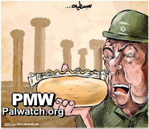 The cartoon shows an Israeli soldier eating a Roman column from the antiquities of Sebastia, as if it were a hot dog. Sebastia was the capital of the northern kingdom of Israel in the 9th and 8th centuries BCE and today is under the jurisdiction of the Israeli Nature and Parks Authority. The cartoon refers to the PA claims that Israel is trying to take over the archeological site of Sebastia – which is located in Area C, under full Israeli security and administrative control.