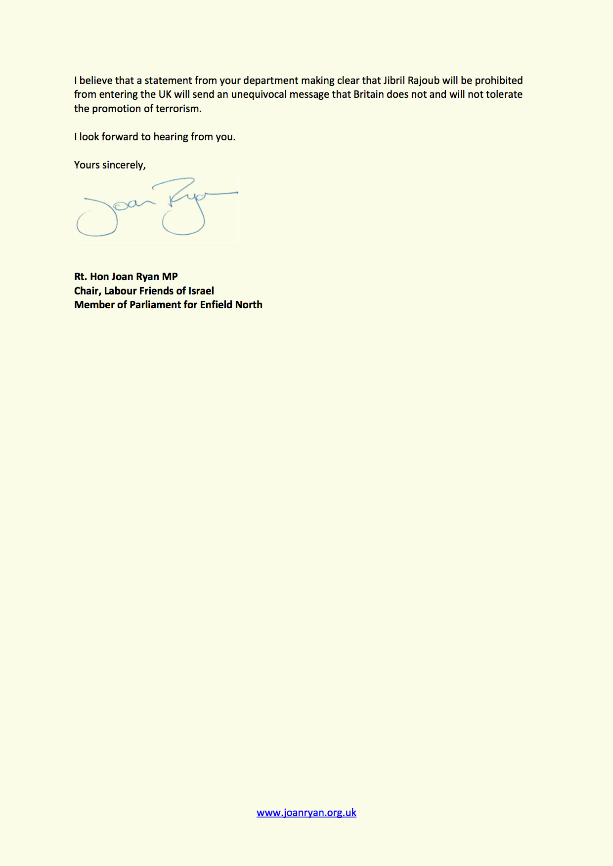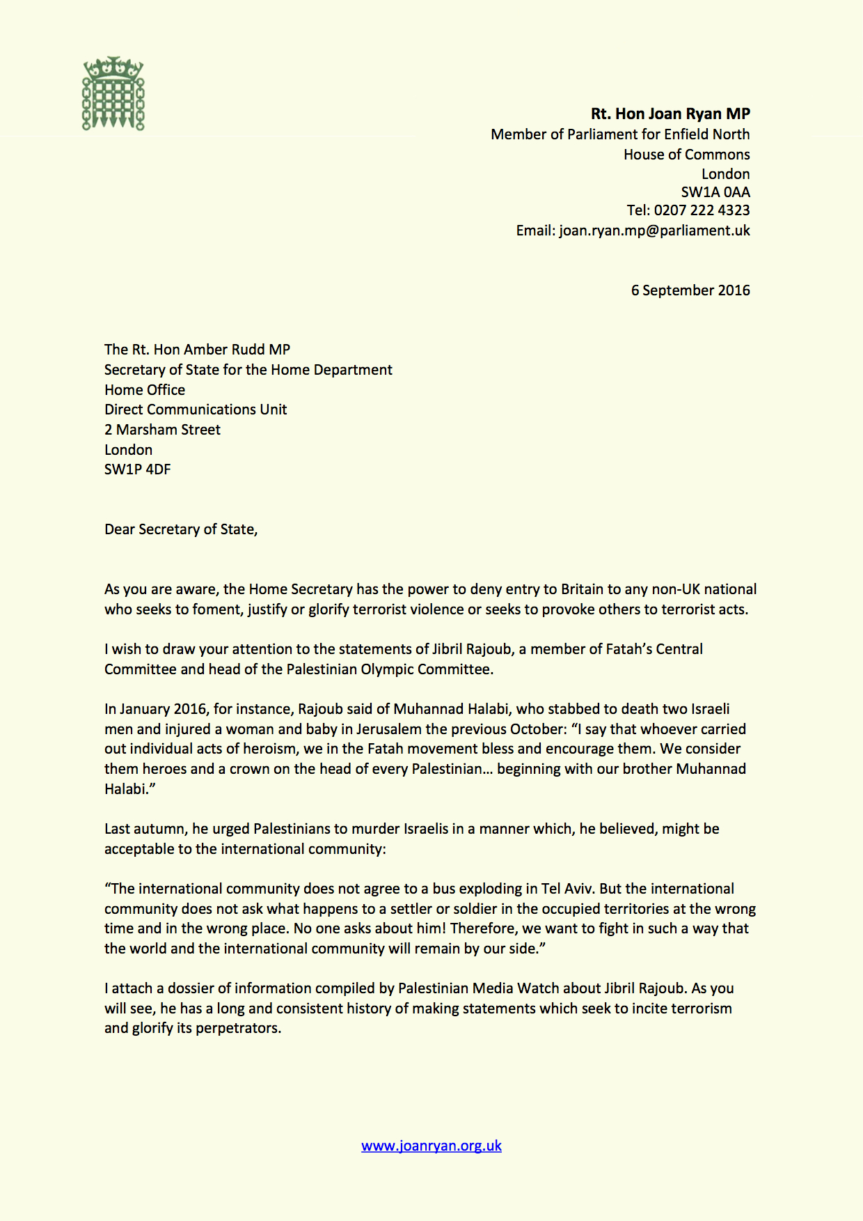 “The Home Secretary has the power to deny entry to Britain to any non-UK national who seeks to foment, justify or glorify terrorist violence or seeks to provoke others to terrorist acts... I wish to draw your attention to the statements of Jibril Rajoub, a member of Fatah’s Central Committee and head of the Palestinian Olympic Committee... I attach a dossier of information compiled by Palestinian Media Watch about Jibril Rajoub. As you will see, he has a long and consistent history of making statements which seek to incite terrorism and glorify its perpetrators. I believe that a statement from your department making clear that Jibril Rajoub will be prohibited from entering the UK will send an unequivocal message that Britain does not and will not tolerate the promotion of terrorism.”